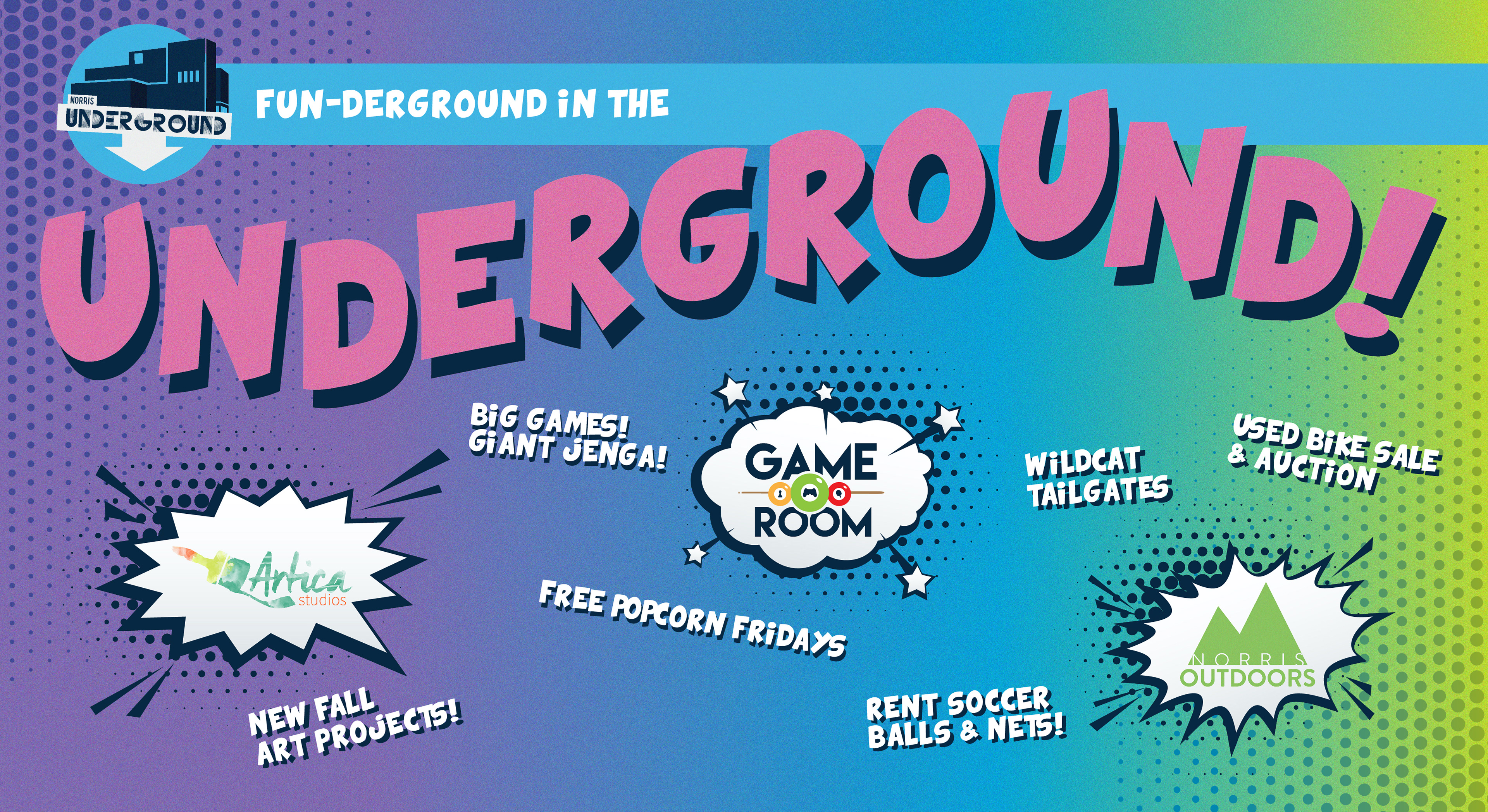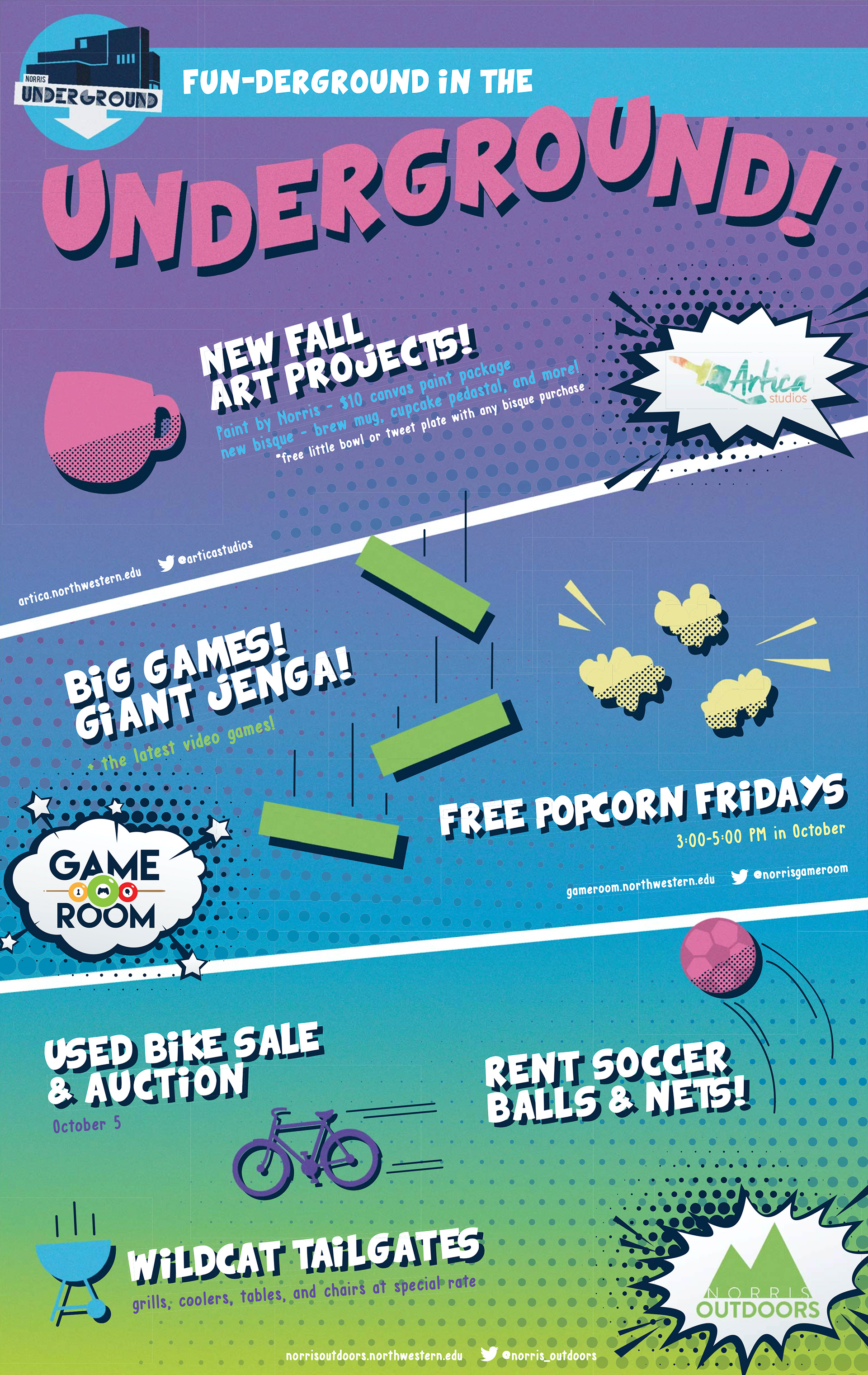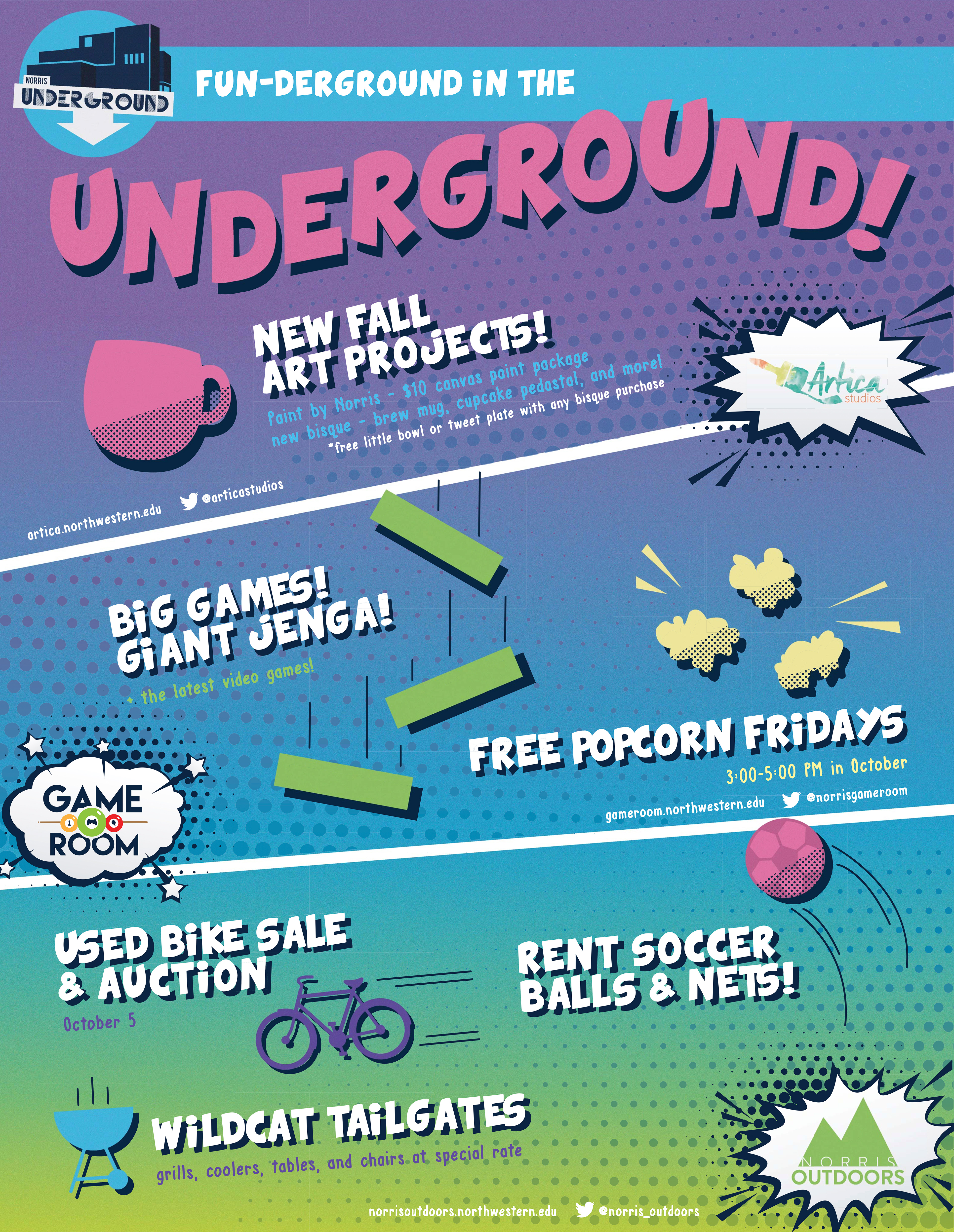 Physical and digital signage for an event in Northwestern University's Norris Underground.