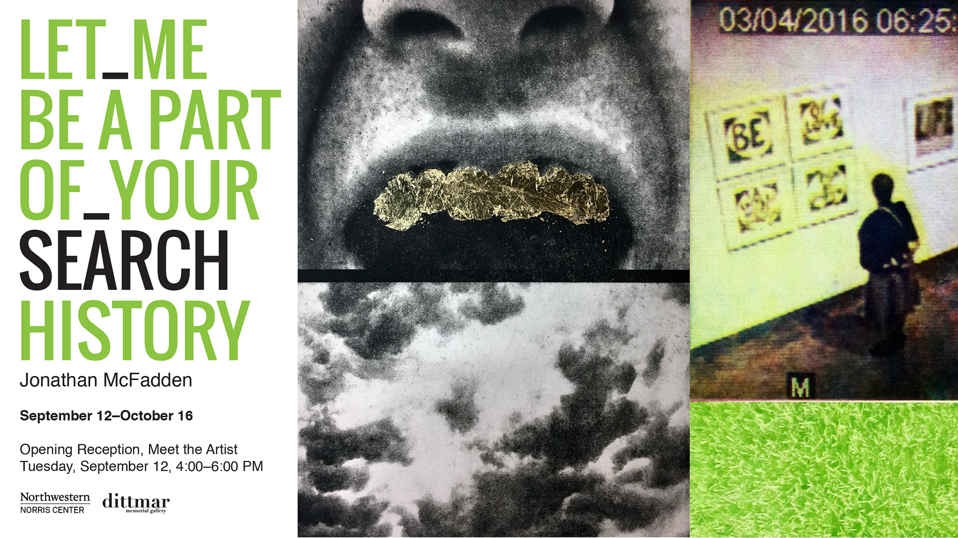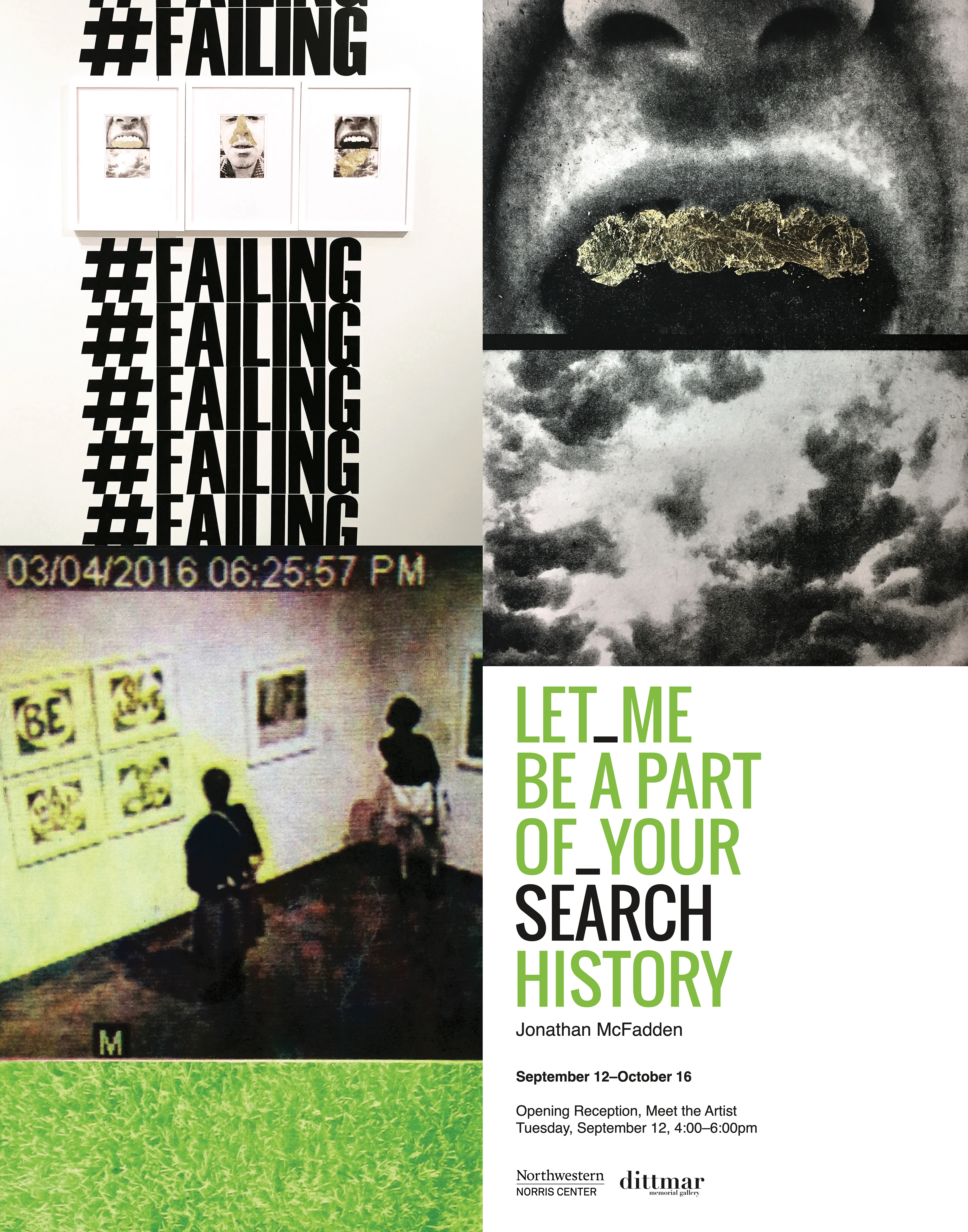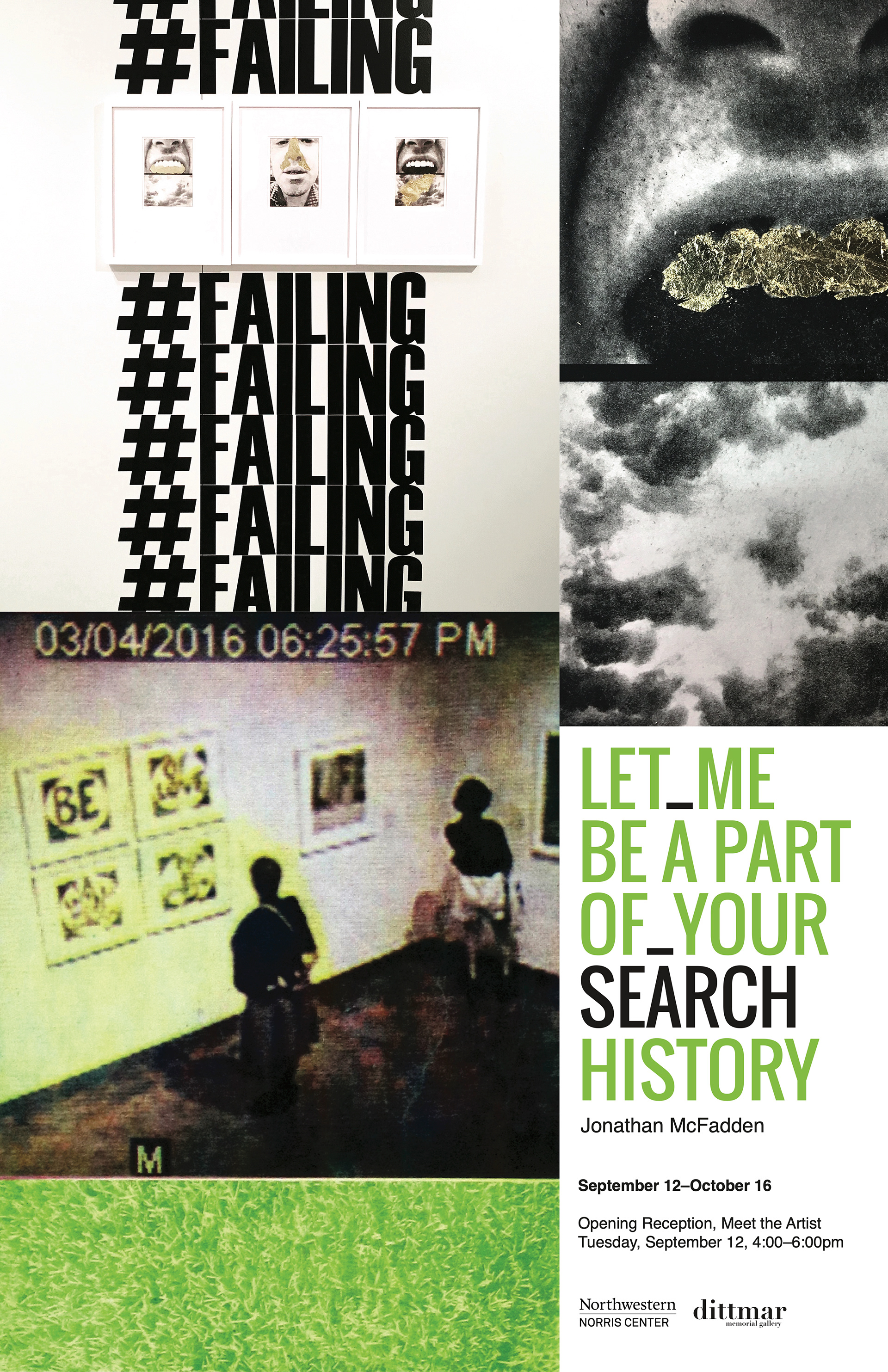 Physical and digital signage for an opening at Northwestern University's Dittmar Gallery. All photographs feature work by Jonathan McFadden.