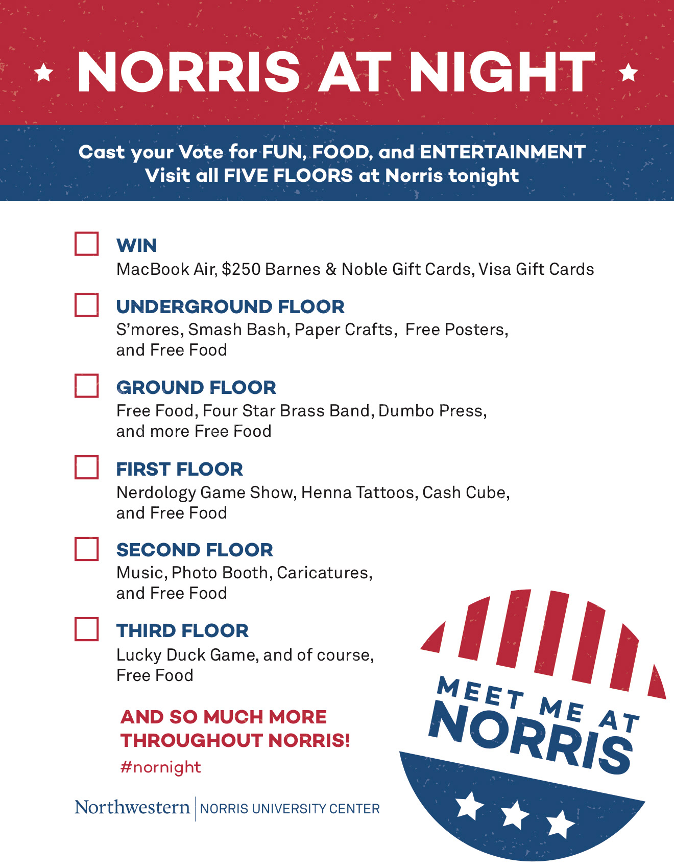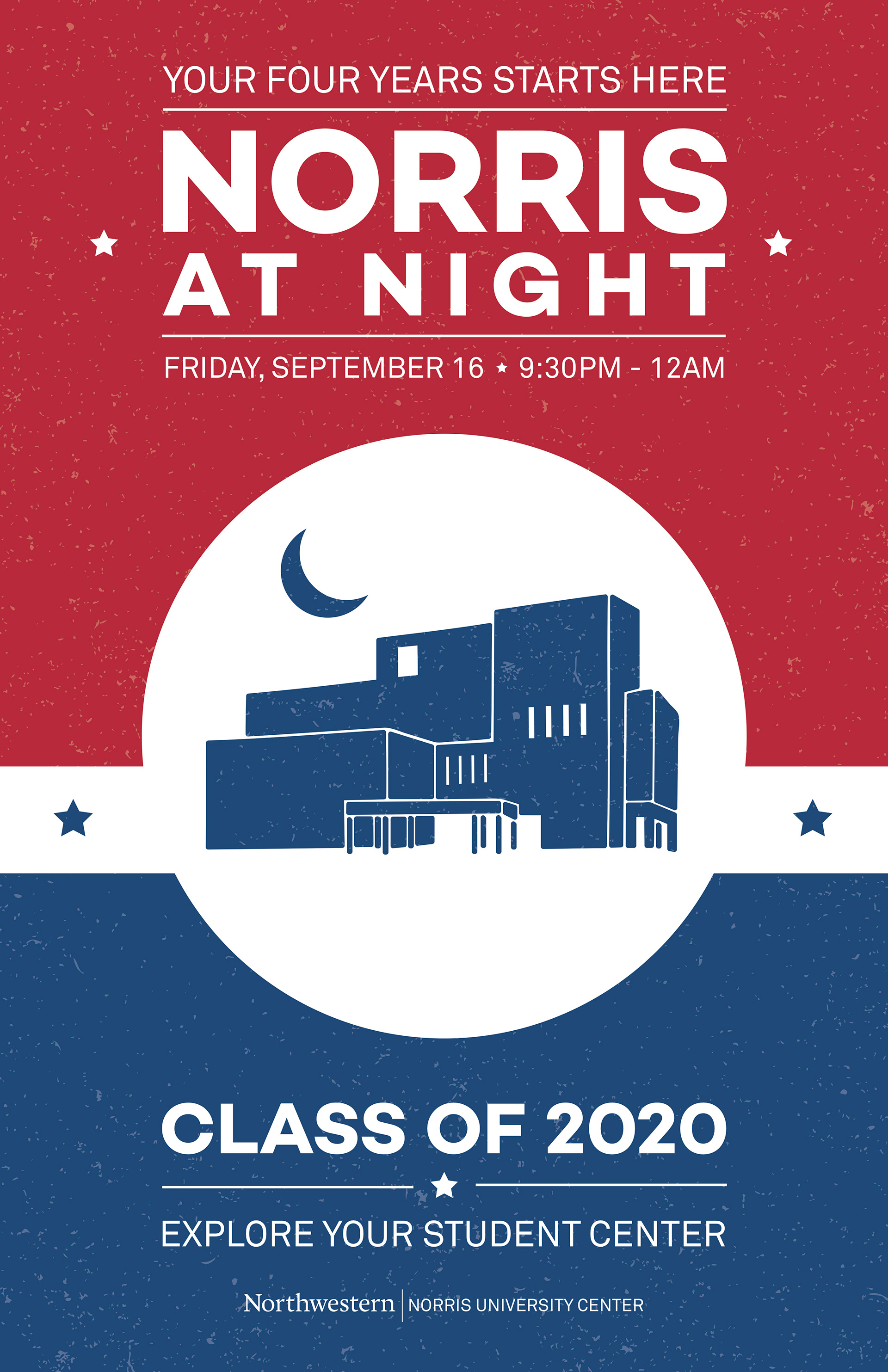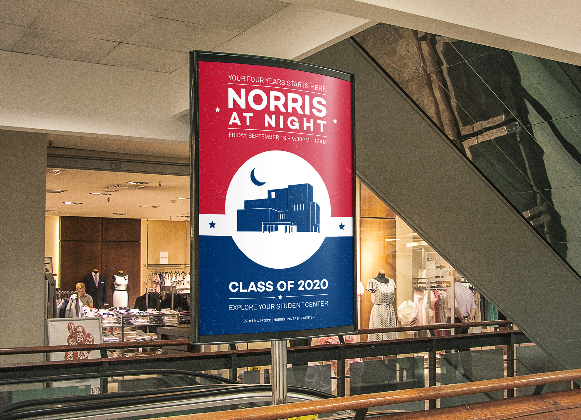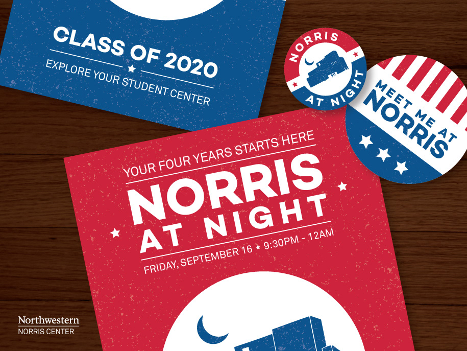 Campaign for the Norris at Night event at Northwestern's Norris Center; intended to help incoming students get to know the student center during orientation week. Signage, flyers, digital promotion, and merchandise.