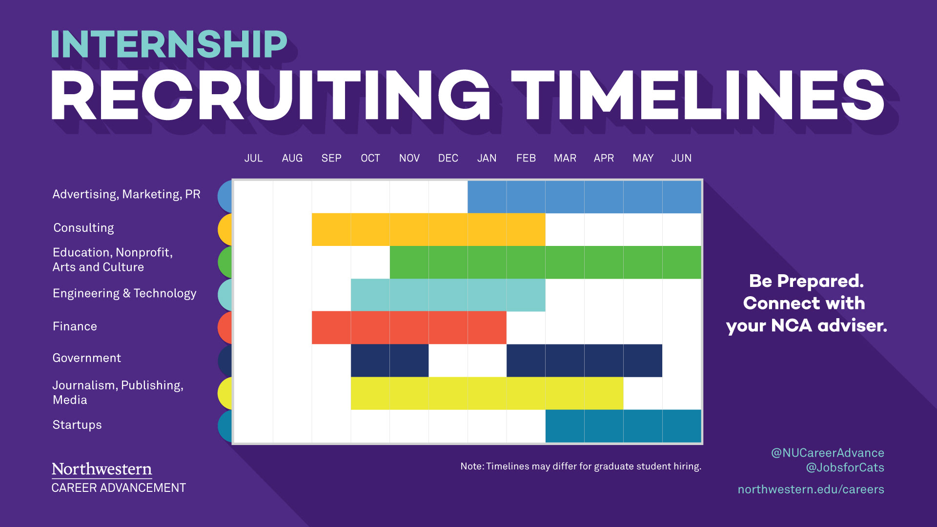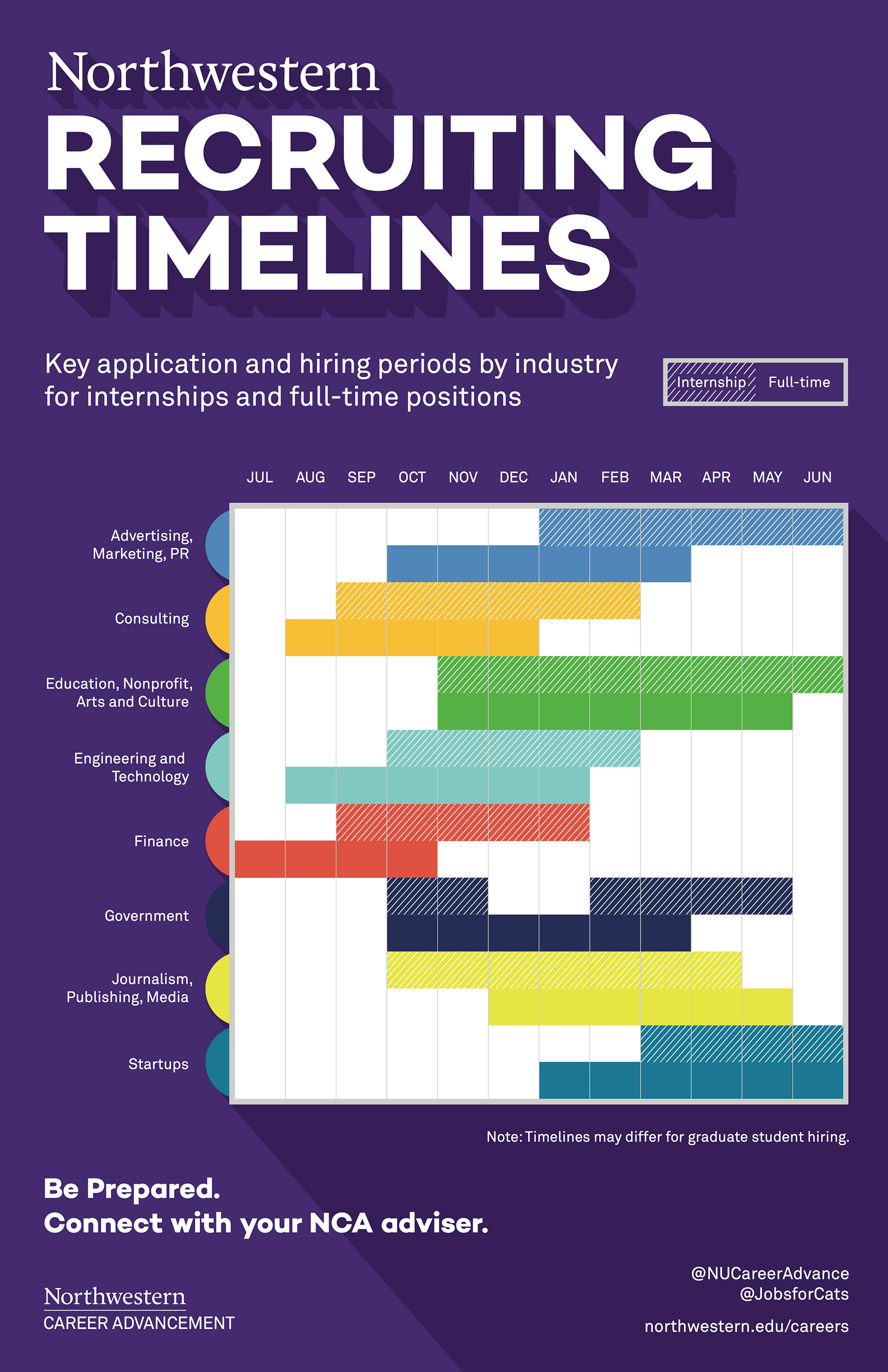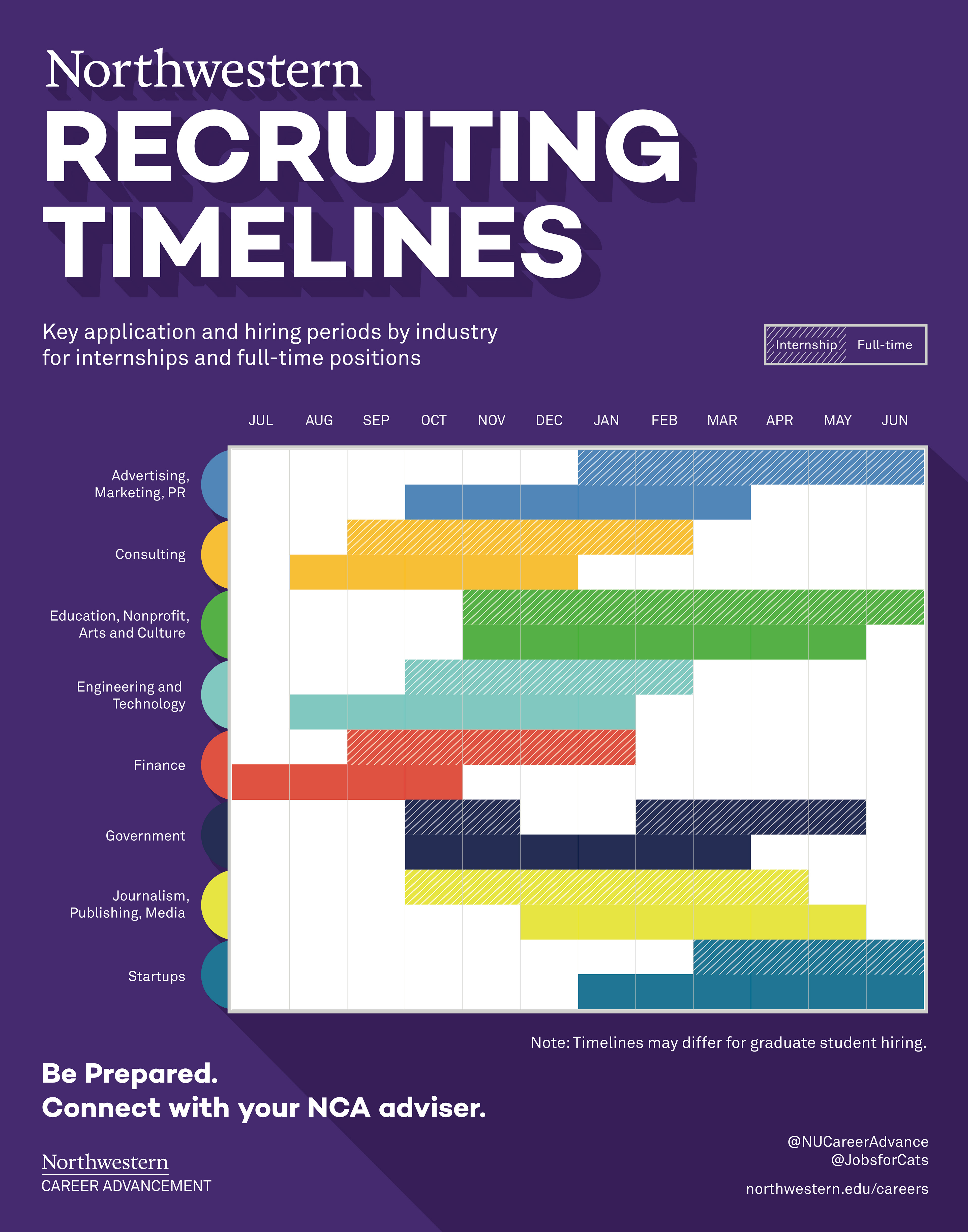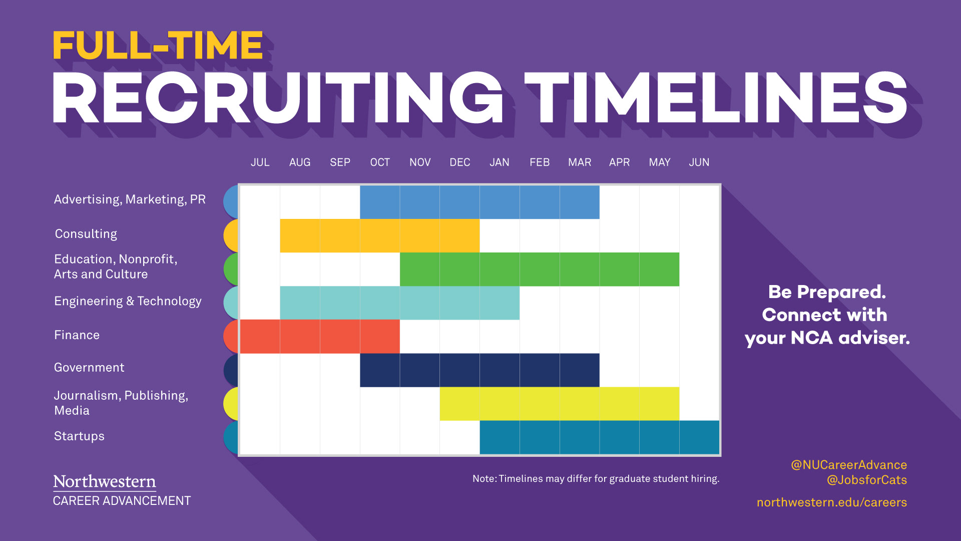 Print and digital signage for Northwestern University Career Advancement to illustrate recruiting timelines for different industries.