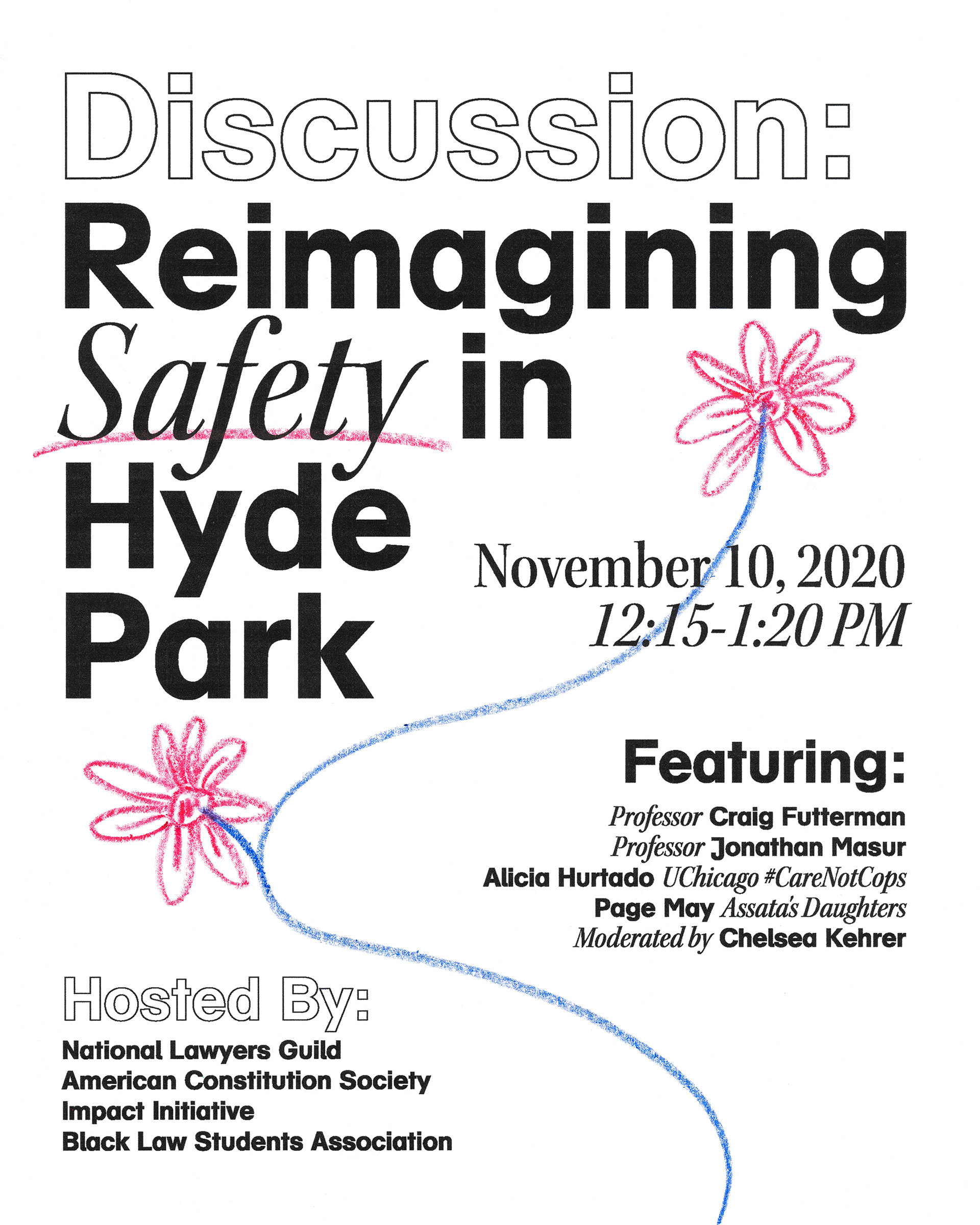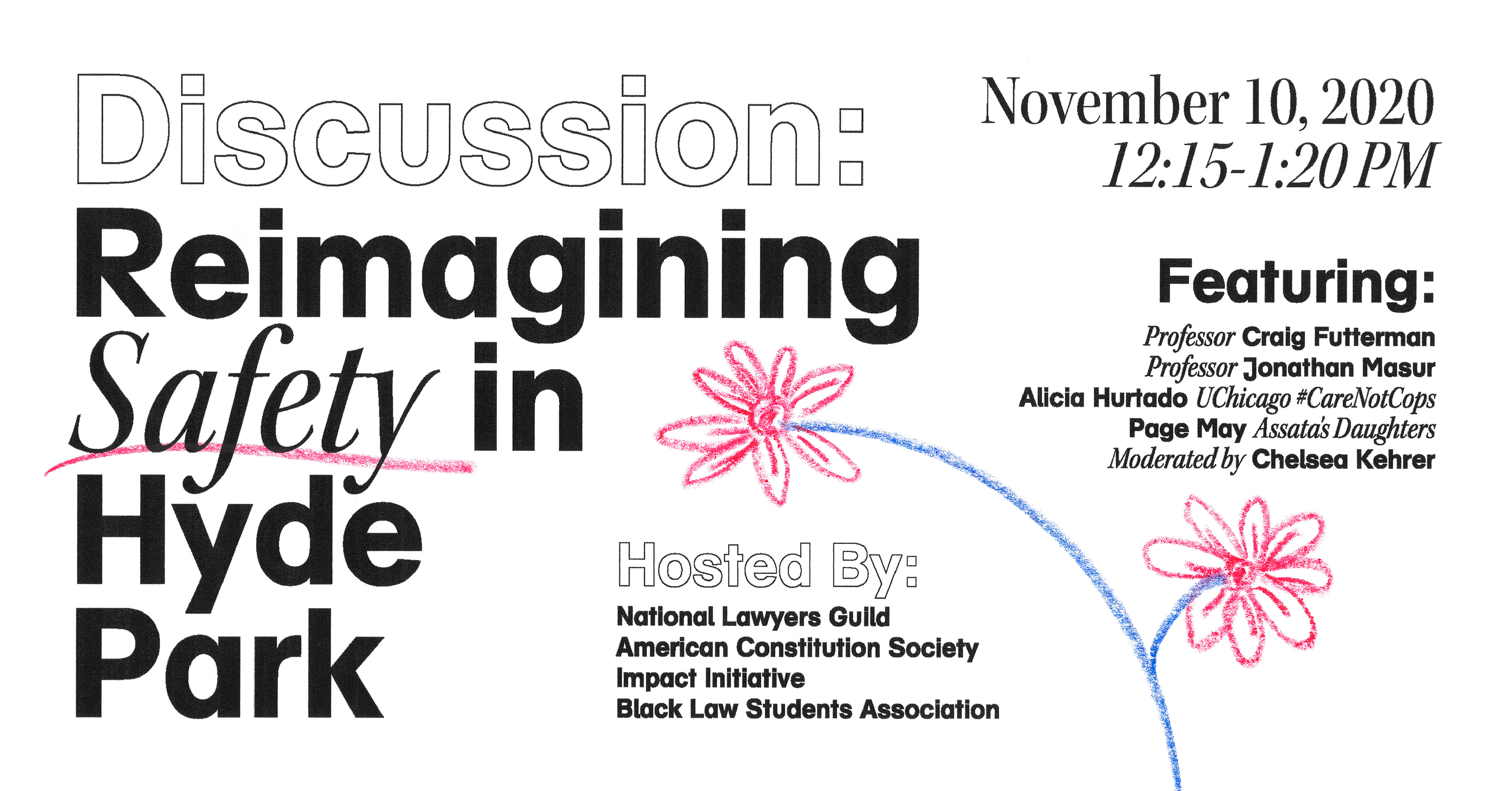 Advertising for a virtual panel hosted by several University of Chicago Law organizations. Illustrations created with crayon on paper.
