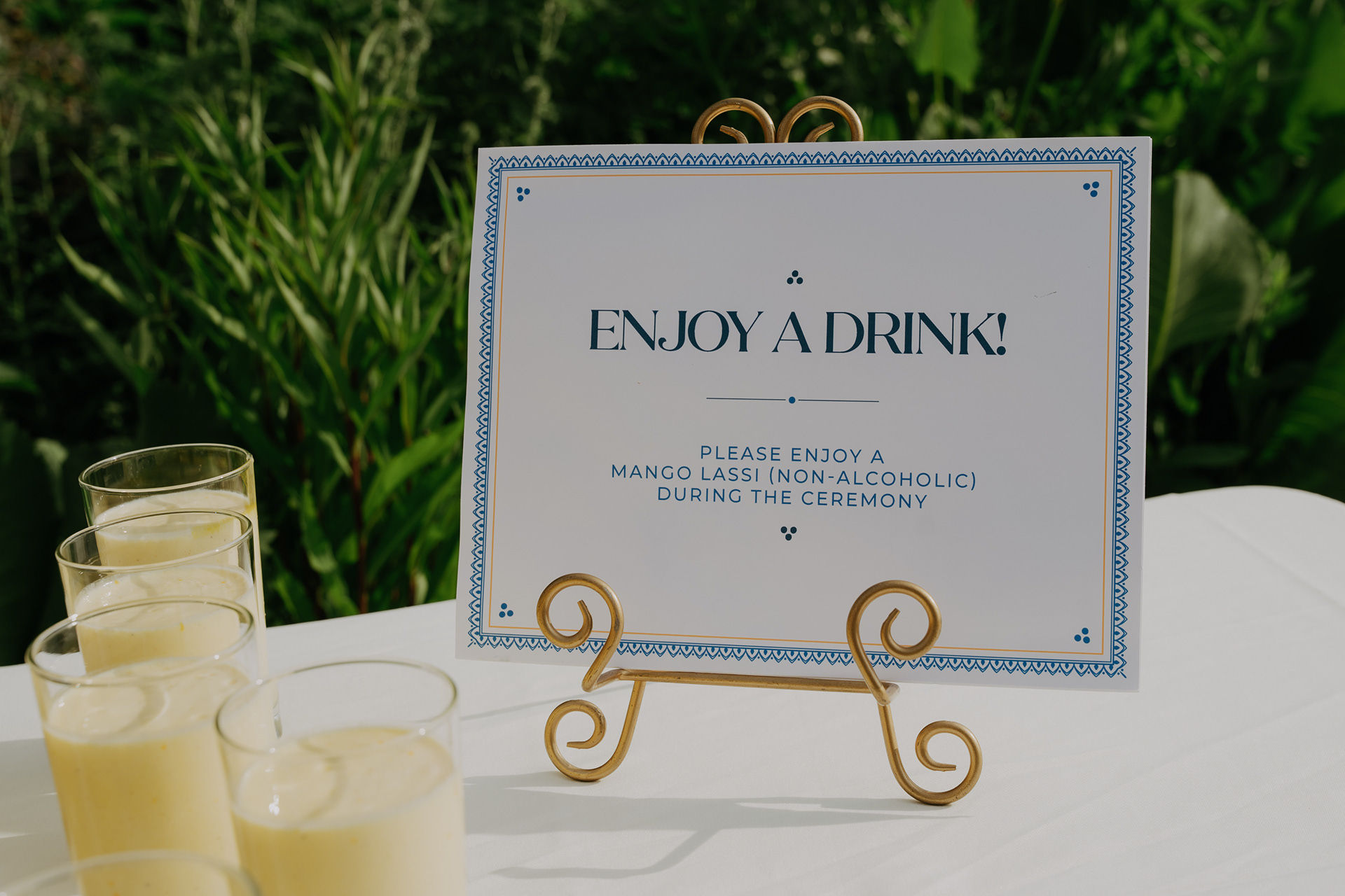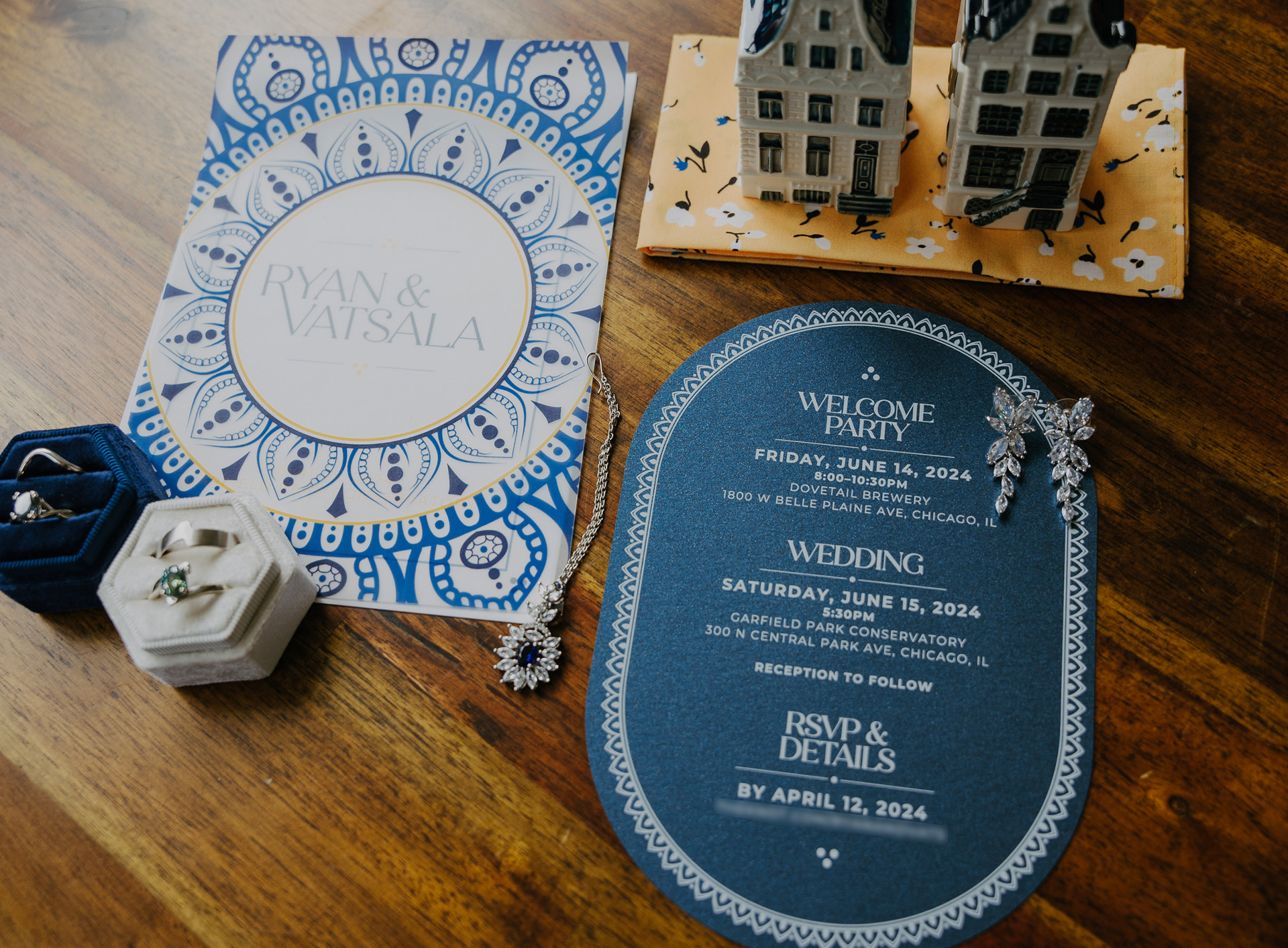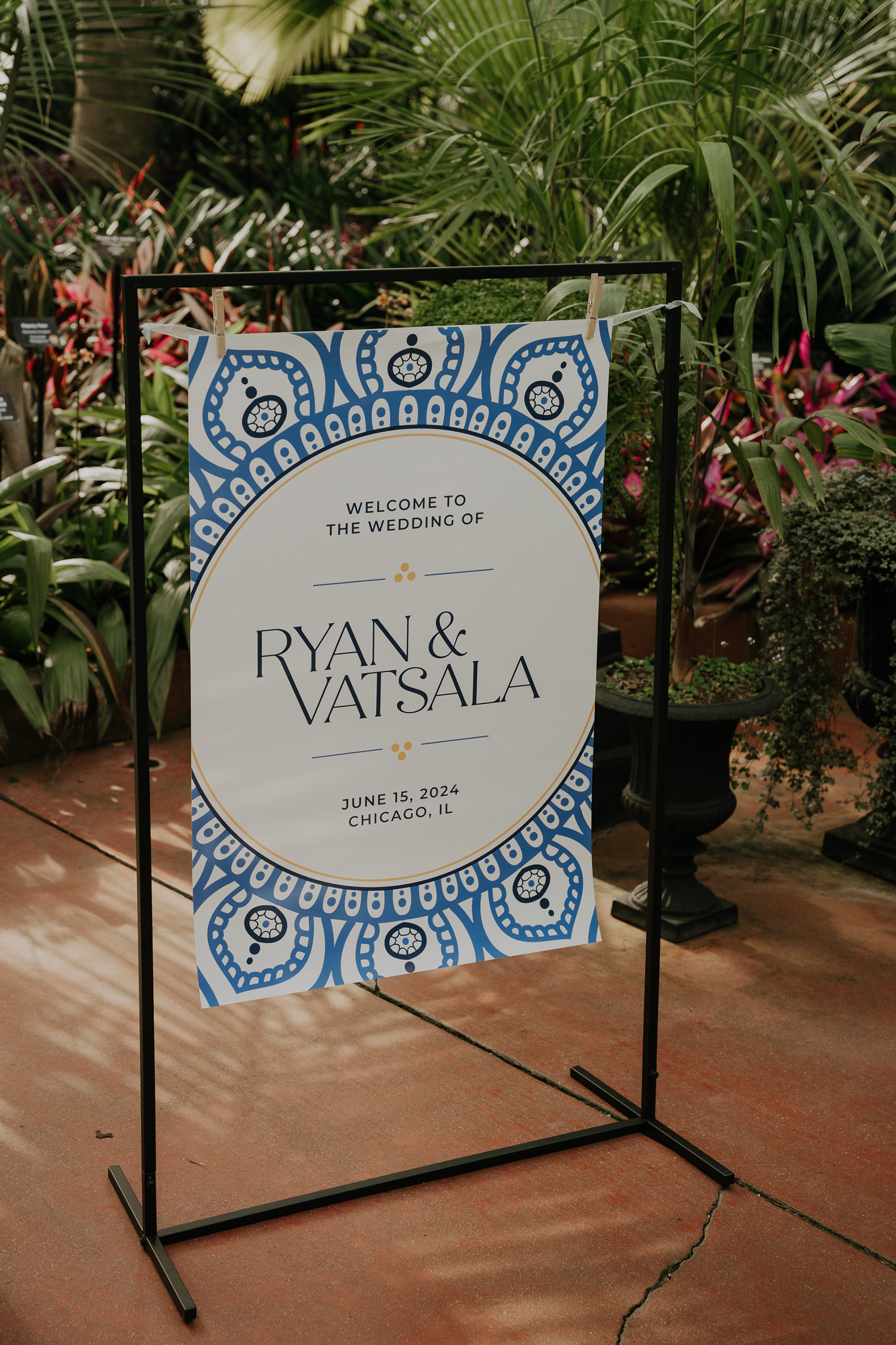 Wedding logo and theme applied to invitations, signage, and more. Pattern and colors envisioned as a fusion of Dutch Delft pottery and Indian mehendi to reflect both brides' heritage. Photos by Alaura Creative.