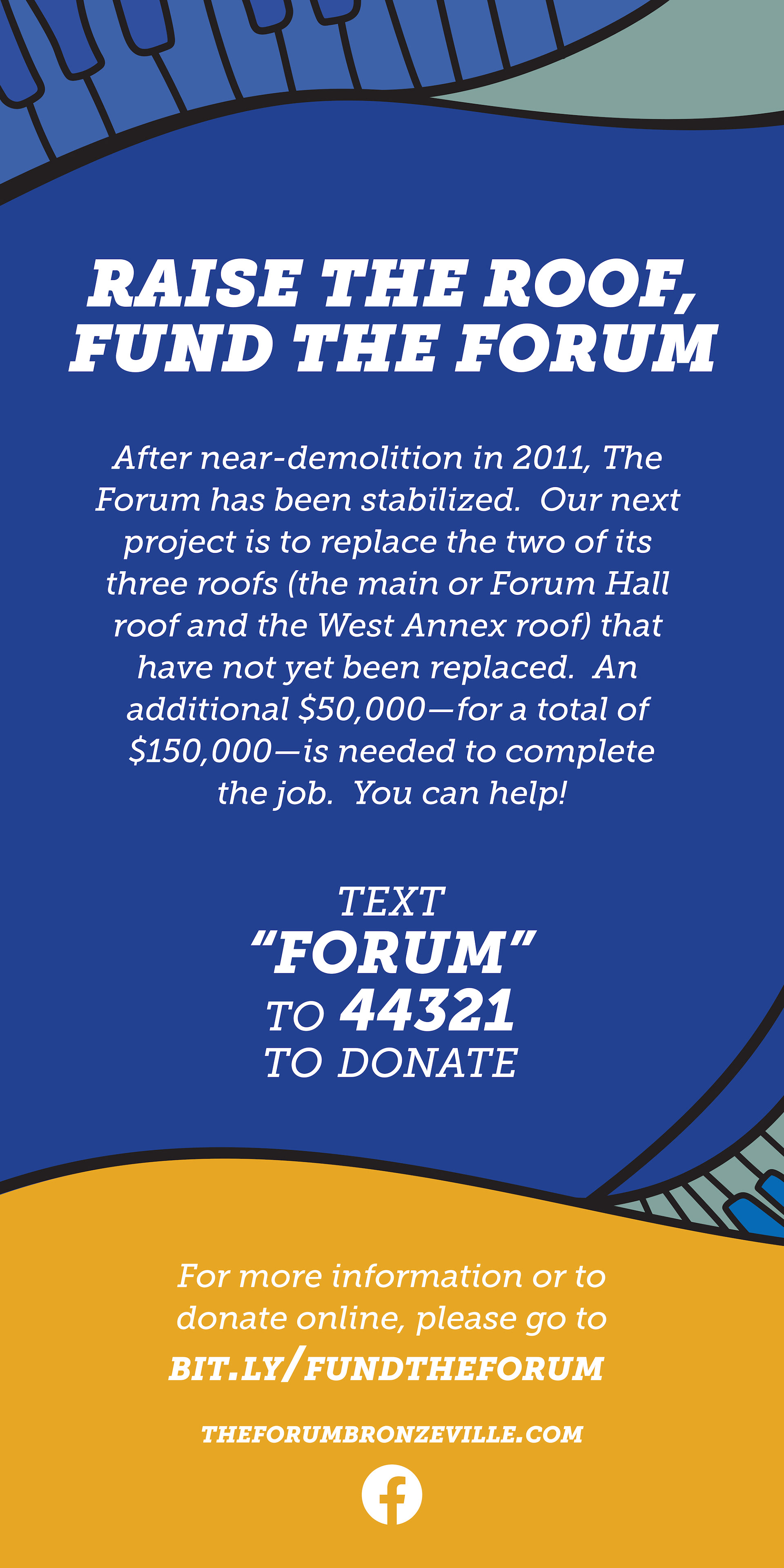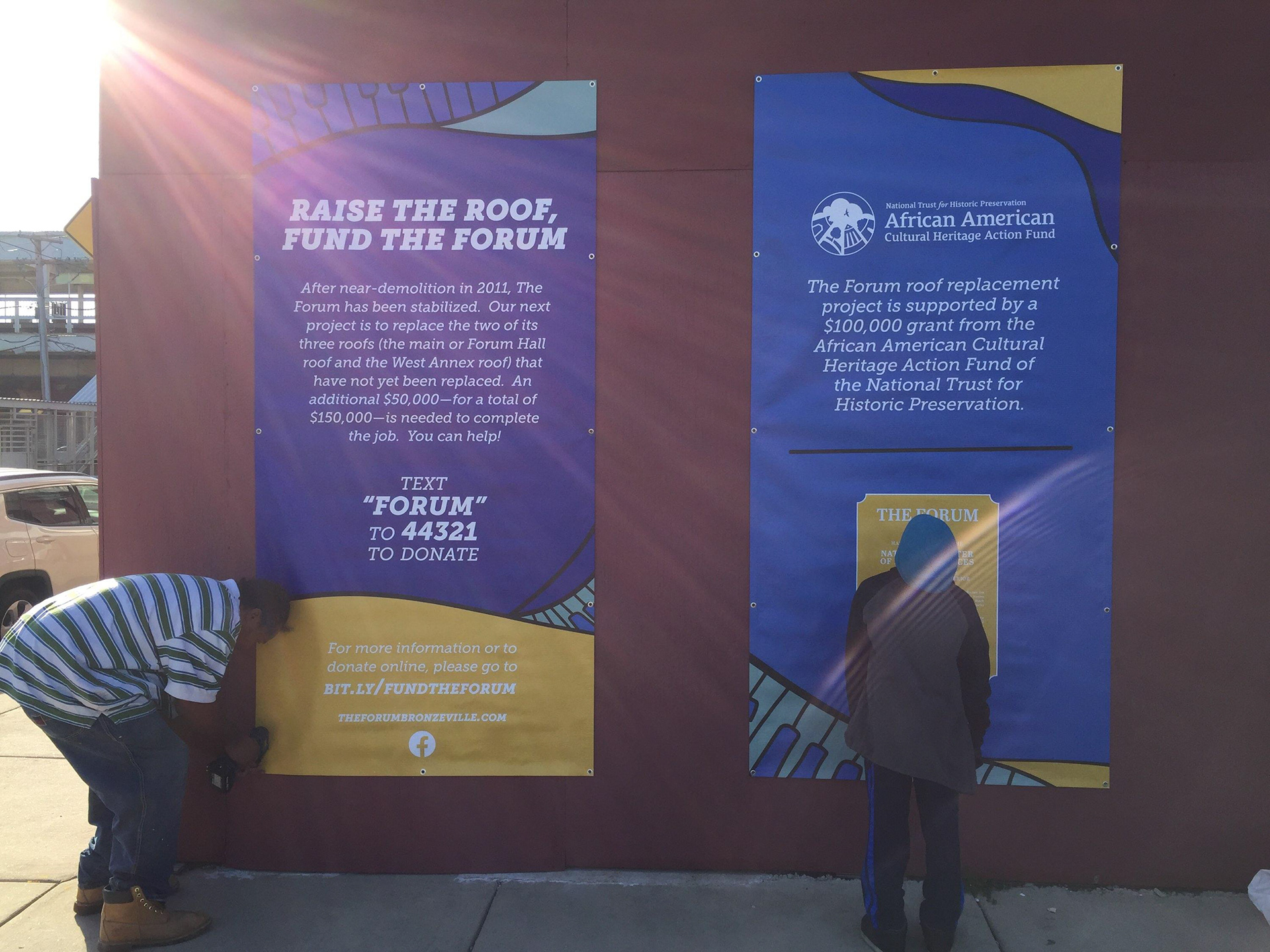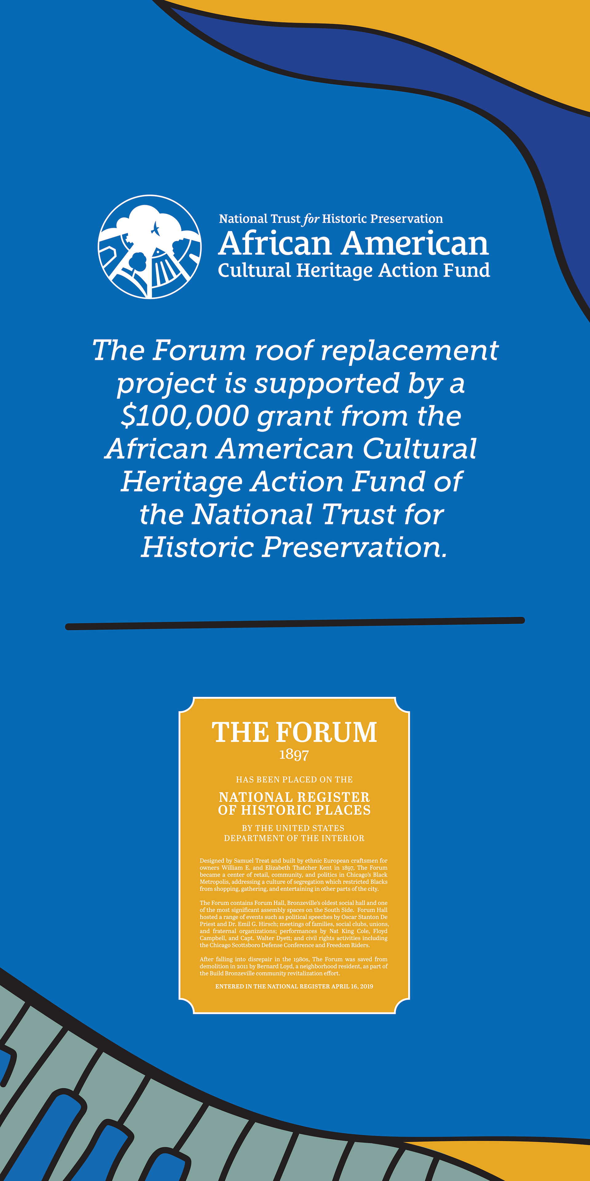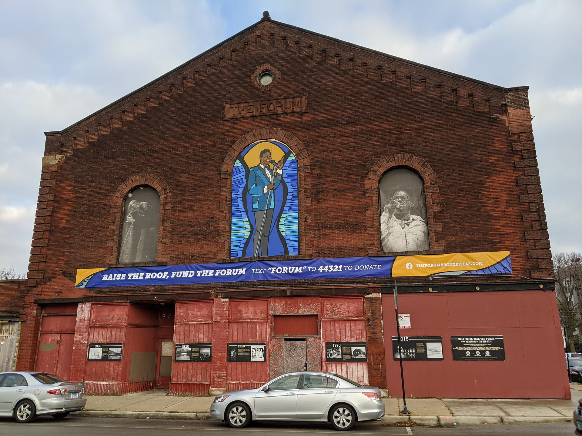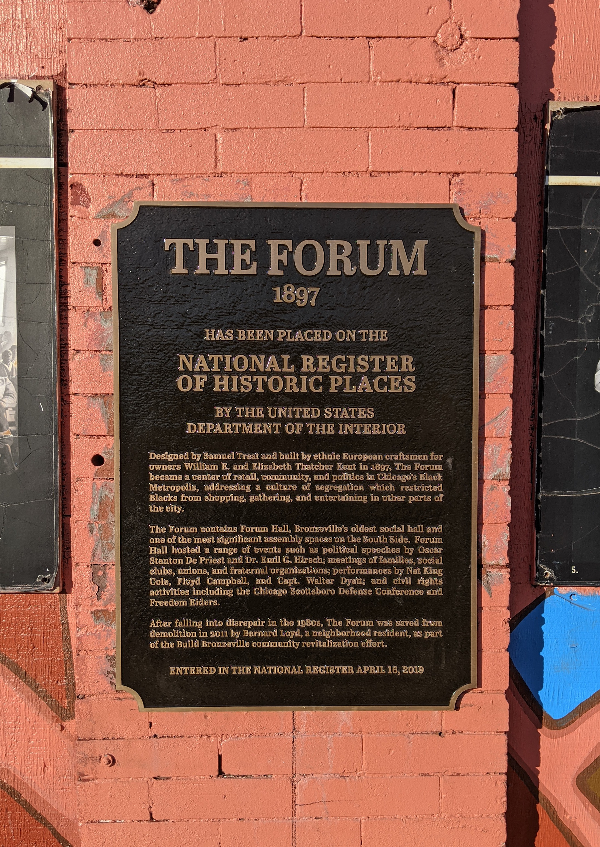 Signage and bronze plaque created for Urban Juncture's renovation of The Forum in Bronzeville, Chicago. Banner style based on Nat King Cole mural by Sam Kirk.